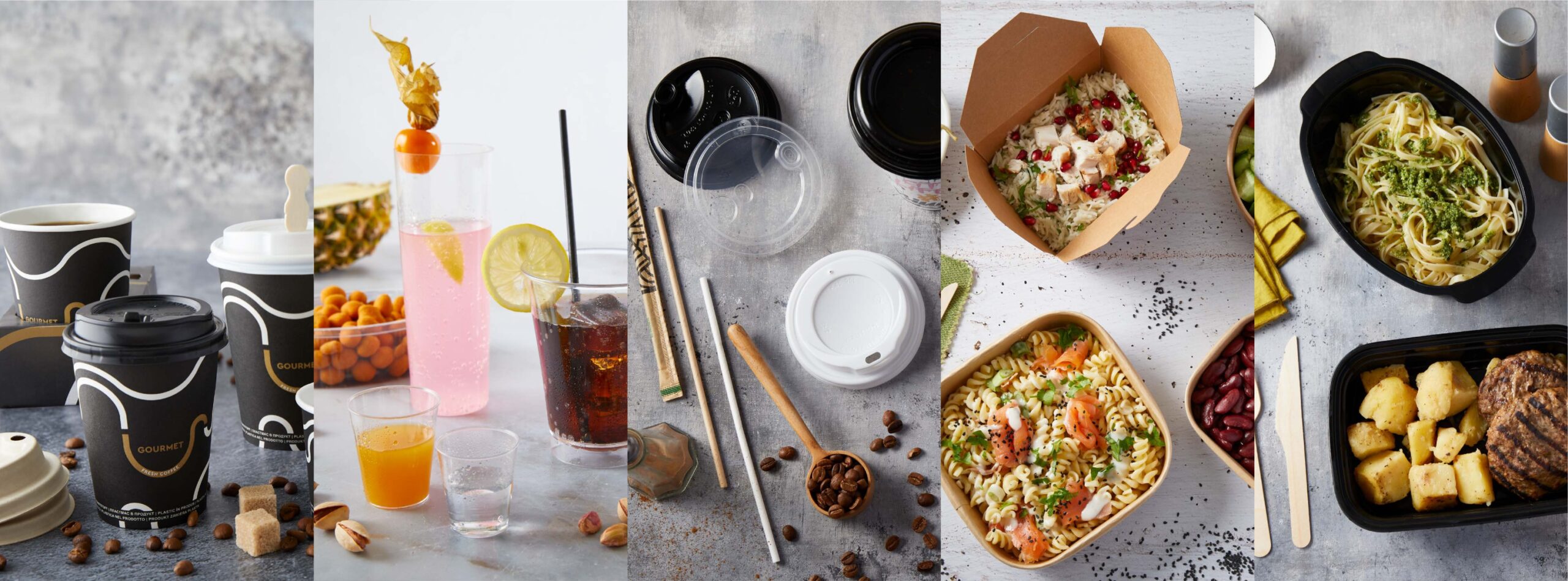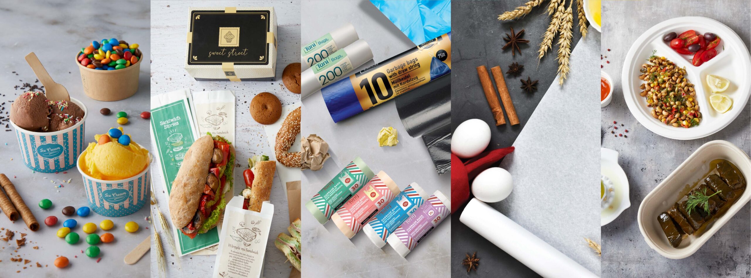 Προσφέρουμε μια ολοκληρωμένη γκάμα συσκευασιών για τρόφιμα και ροφήματα, σχεδιασμένες για ασφάλεια, αντοχή και αισθητική. Κυπελλάκια, κουτιά, σακούλες, καπάκια και δοχεία διαφόρων μεγεθών καλύπτουν κάθε επαγγελματική ανάγκη. Αναλαμβάνουμε επίσης εκτυπώσεις υψηλής ποιότητας πάνω σε κάθε είδος συσκευασίας, προσαρμοσμένες στο λογότυπο και την εταιρική ταυτότητα της επιχείρησής σας, ενισχύοντας την προβολή και την αναγνωρισιμότητα του brand σας.